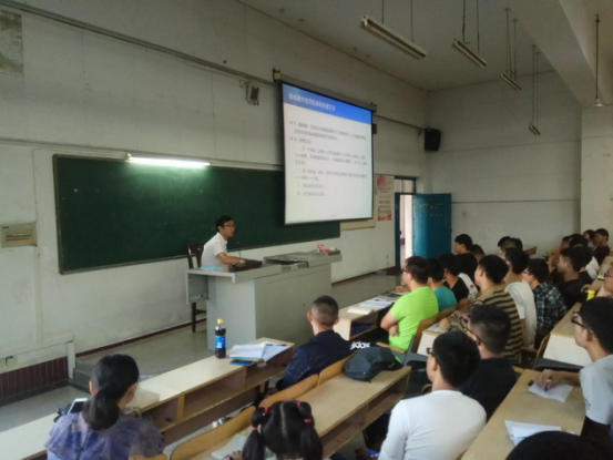 9月11日,材料学院辅导员张国法在2201教室为新生讲解国家、学校资助及大学生医保政策,参加讲座的人员有2017级新生及新生班导生。