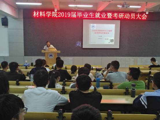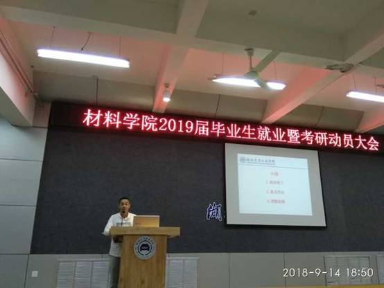 为帮助2019届毕业生明确就业方向、把握就业形势、提升就业质量,推动我院2019届毕业生就业、考研工作稳步向前,9月14日晚,材料学院在6113报告厅召开了2019届毕业生就业暨考研动员大会。院分党委书记杨陵郧,副院长王天国,学工办张国法、骆无思及2019届全体毕业生参加了此次会议。