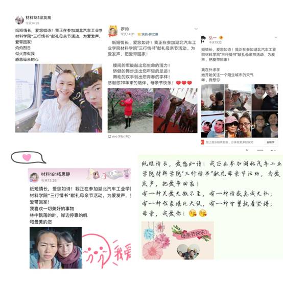 慈母手中线,游子身上衣,是慈母的一片深笃之情;谁言寸草心,报得三春晖,则是子女的一份绵薄感恩。在“三行情书”献礼母亲节活动中,我院各基层团支部、学生会、志愿者联合会、金工科技协会在院分团委的统一引导下,积极组织开展以“纸短情长 爱您如诗”为主题线上、线下活动。线下活动,通过原创三行情书,拍摄感恩小视频,自编自演感恩小话剧,公开演讲朗诵等多元化形式;线上活动,5.12母亲节当天把“三行情书”内容和有意义的亲子照发QQ空间、微信朋友圈,并附上以下文字:纸短情长,爱您如诗!我正在参加湖北汽车工业学院材料学院“三行情书”献礼母亲节活动,为爱发声,把爱带回家。表达了那份对母亲平日难以言表的温馨祝福和深沉爱意。