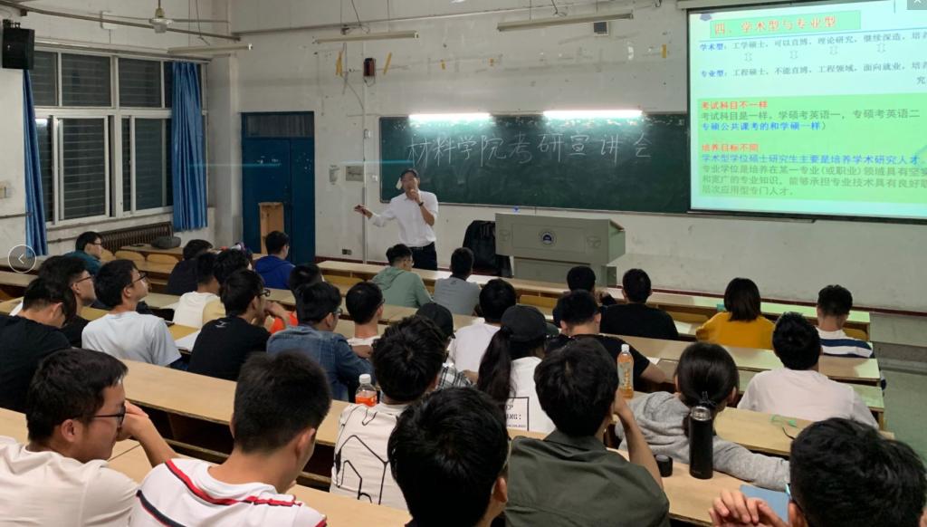会上,王天国首先从考研人数持续攀增、推免逐渐成为主流、调剂变得不可预测、学术型硕士一位难求四个方面深入浅出的介绍了目前考研的大环境与形势,使得全体同学对考研形势以及报考学校有了理性的分析与思考。接着,他分析了近几年学院考研数据和身边案例,并结合自身考研经历鼓励同学们积极备研,砥砺前行。他强调,既然选择了考研,就不要三心两意,轻言放弃,要坚定信心,持之以恒,必有所成。他同时表示,学院会尽全力为同学们升学深造提供良好的学习和生活环境。另外,王天国介绍了我校材料学院研究生教育概况与培养特色以及相关的调剂政策,欢迎各位学生选择留在本院进行硕士学位深造。