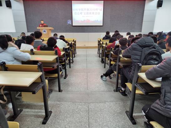 在“考试月”到来之际,为加强学生考风、考纪教育,促进优良学风建设,12月1日晚,材料学院在6113教室组织开展“诚信应考”主题教育活动,辅导员骆无思,材控181班主任李志辉,18级、19级学生参加了此次活动。