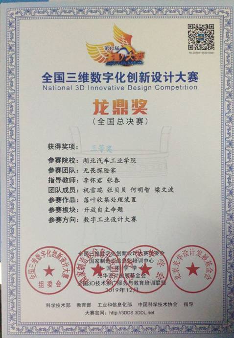 我校学子在李怀君等指导老师的带领下积极参赛,材工学子祝雪瑞同学作品“落叶收集处理装置”荣获数字工业设计大赛方向全国总决赛三等奖。