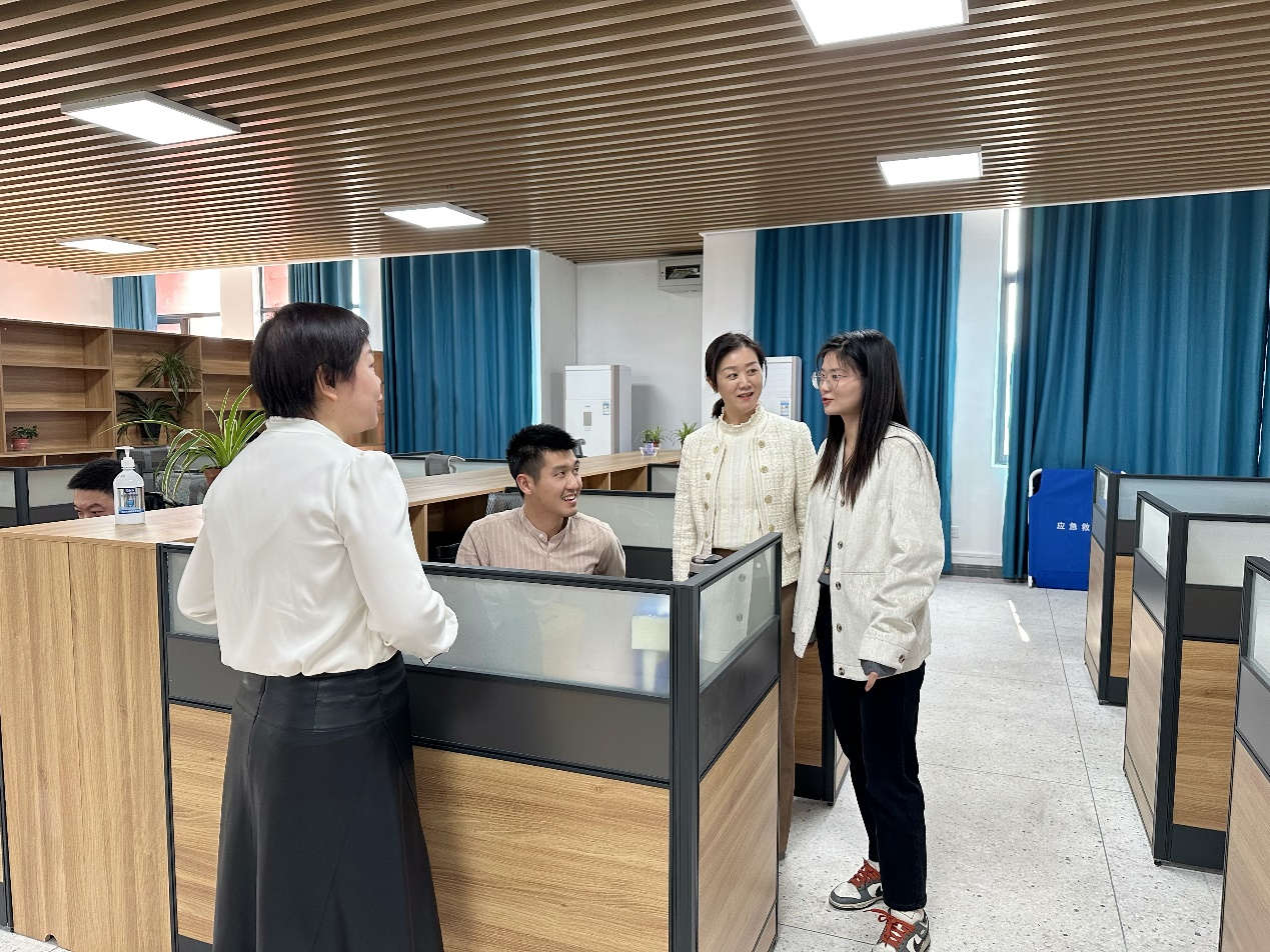 期间,杨陵郧一行来到产教中心博士工作室,亲切慰问材料学院的各位博士教师,向他们表达学院对优秀人才的关心和关爱,给大家加油鼓劲。随后一行人参观了博士工作室,在参观过程中,王越博士汇报了我院国家自然科学基金项目书撰写的进度,并就材料专业科研成果转化、产教融合等方面进行了介绍。