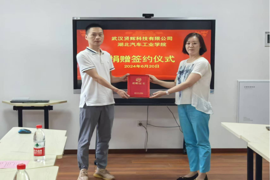杨陵郧对参会来宾的到来表示热烈欢迎。她介绍了湖北汽车工业学院建校以来在人才培养、推进升大、申博建设进程中所取得的突出成果,并对公司支持学校教育事业发展表示衷心感谢。双方代表签署了100万元捐赠协议,杨陵郧向武汉贤辉科技有限公司移交了捐赠支票、颁发捐赠荣誉证书。