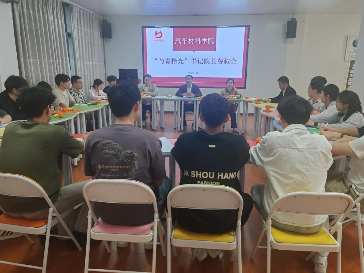 为贯彻落实立德树人根本任务,加强师生双向沟通,切实解决学生发展困惑,3月26日下午,汽车材料学院在南校区心理健康中心团体辅导室举办“与青拾光”书记院长餐叙会。学院院长李建、院长助理赵齐、辅导员骆无思、班主任王友勇以及2022级学生代表30余人参加会议,会议由副书记何君主持。