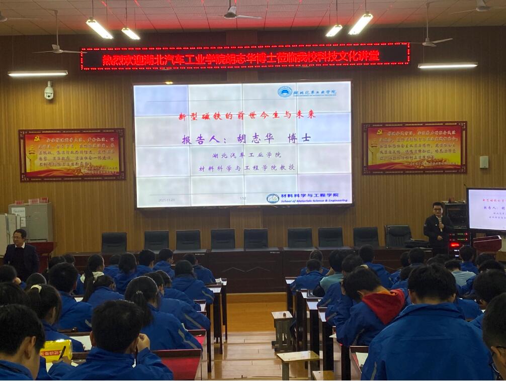 晚上7:00,胡志华教授受邀在阳新一中明理楼学术报告厅开展了“新型磁铁的前世今生与未来”主题科普讲座,国奖获得者孟城诚等同学现场给同学们讲解和展示了他们国家一等奖获奖作品热能车、势能车,教授的科普讲座,学长的创新作品,赢得了同学们的阵阵欢呼和掌声。