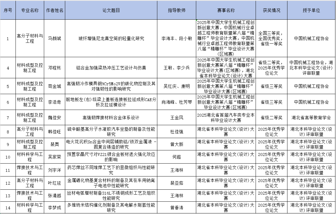 表1 汽车材料学院2025届本科毕业论文(设计)获奖名单