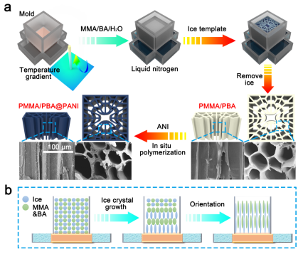 该研究成果报道了一种在极端条件下具有强大机械和电磁波吸收效果的聚合物海绵材料。具体而言,在具有温度梯度设计的3D打印模具中,以定向迅速生长的冰晶为模板进行聚合,得到具有定向孔道的聚合物前驱体,然后采用二次模板法设计合成了具有定向孔道的三元聚合物海绵。这种PMMA/PBA@PANI海绵具有独特的负泊松比特性,当纵向压缩应变为25%时,单次压缩循环的泊松比达到-1.52,机械能吸收能力为5.1 mJ/cm3。同时,厚度为4毫米的海绵材料对X波段电磁波吸收效率可达到90%以上。该海绵材料为电磁波的引入和消耗提供了良好的结构条件,是极端条件下电磁波吸收的理想选择。