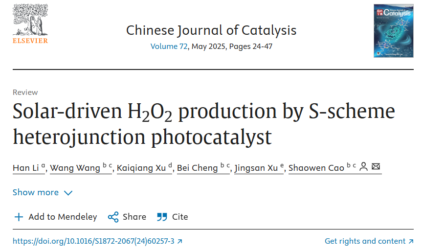 近日,我院青年教师李瀚博士和武汉理工大学曹少文研究员团队在太阳能转化领域取得重要进展,其作为第一作者的综述论文“Solar-driven H2O2 production by S-scheme heterojunction photocatalyst” 发表于催化领域顶级期刊《Chinese Journal of Catalysis》(中科院一区Top期刊,IF=17.7)。