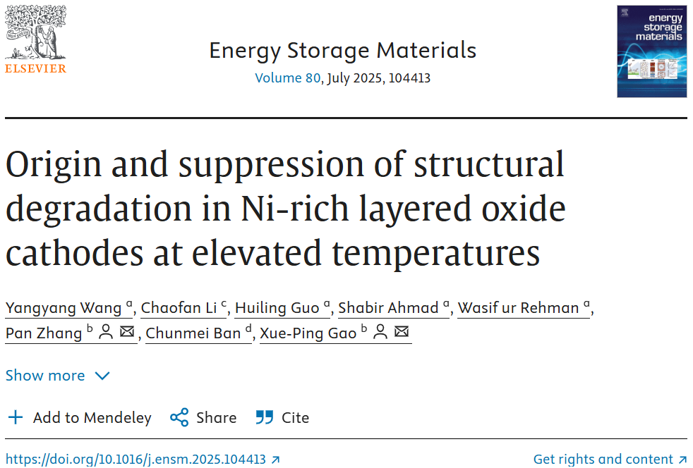 近日,我院青年教师王杨阳博士和南开大学高学平教授团队在锂离子电池正极材料领域取得重要进展,其作为第一作者的研究论文“Origin and suppression of structural degradation in Ni-rich layered oxide cathodes at elevated temperatures” 发表于材料科学领域顶级期刊《Energy Storage Materials》(中科院一区Top期刊,IF= 20.2)。