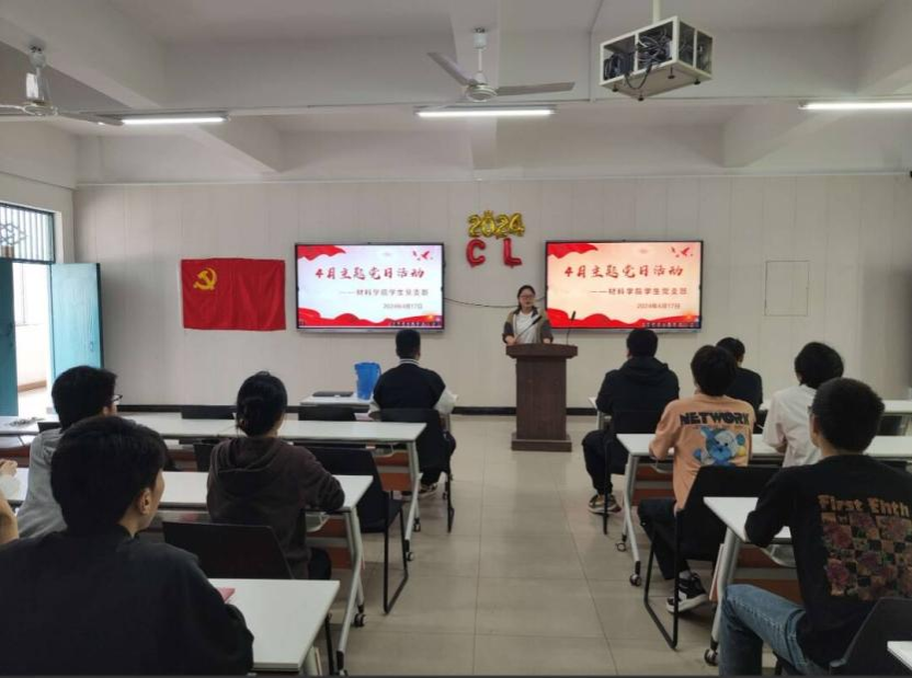 4月17日中午,材料学院学生党支部在材料实验楼303开展4月份主题党日活动,材料学院学生党支部书记詹韩琼,辅导员李诗、王誉翔、李志强和全体学生党员参加了此次活动,活动由学生党员谢铭燕主持。