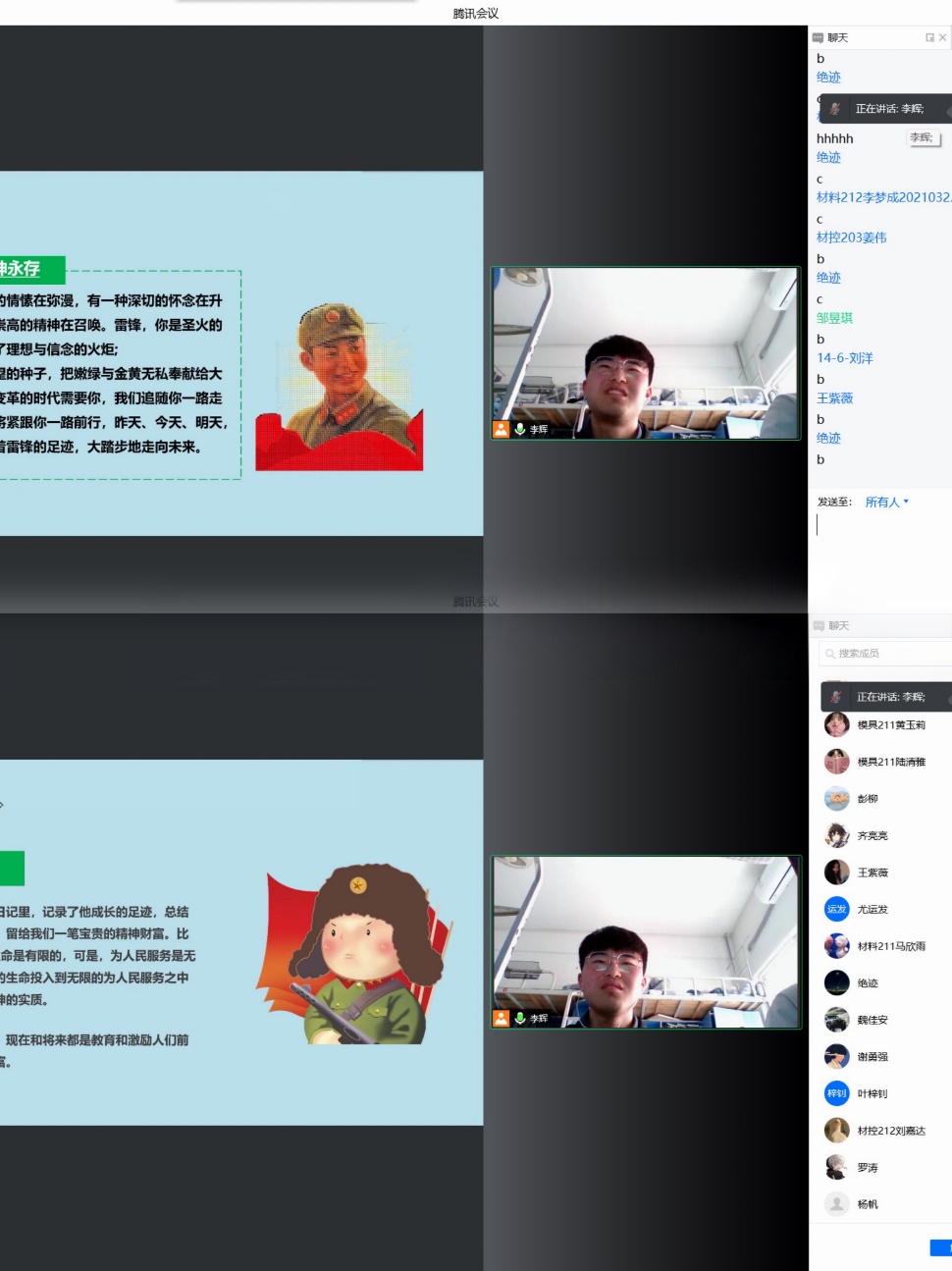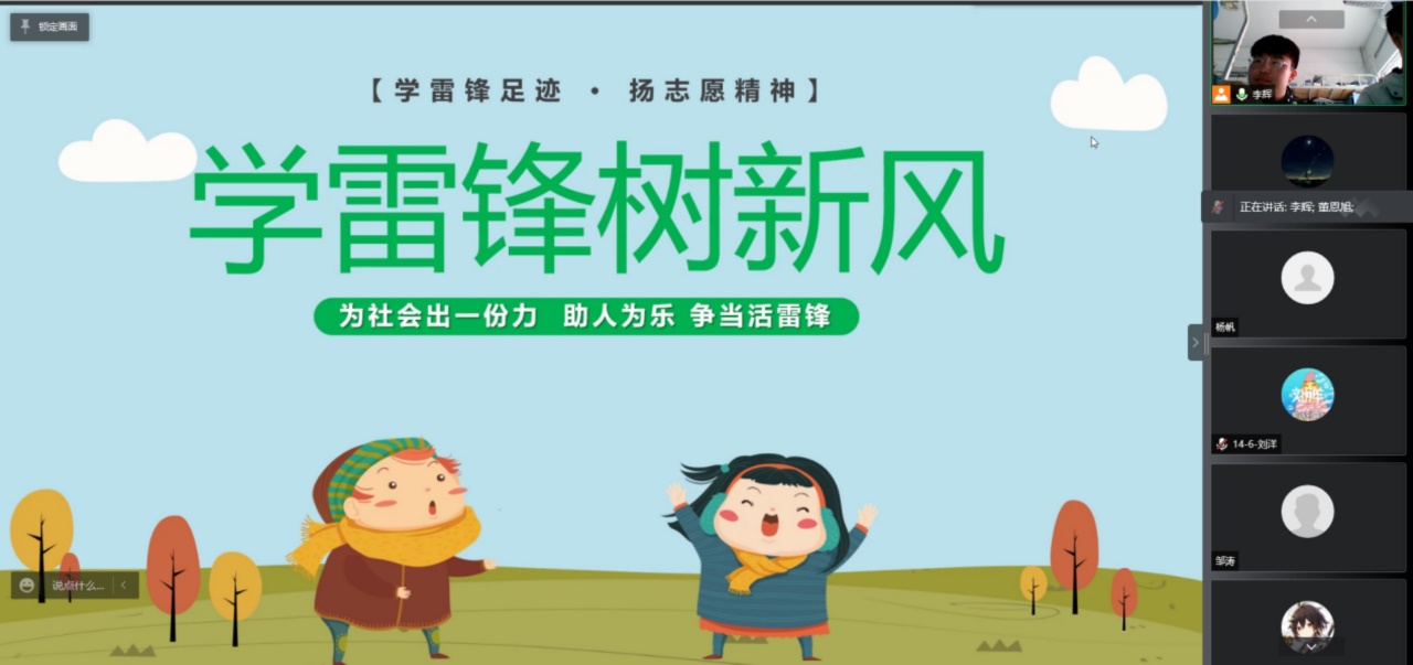 3月5日是学雷锋纪念日,为纪念雷锋同志,践行和弘扬雷锋精神,助力文明城市创建,材料学院“爱之舟”青年志愿服务队在3月5日14时开展了“学雷锋,树新风”线上主题教育宣讲活动。为配合学校疫情防控工作,本次活动采用腾讯会议线上宣讲,由材料科学与工程学院的志愿者同学和部分家和苑社区小朋友参与。