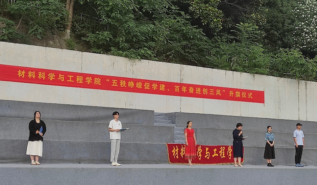 为进一步加强社会主义核心价值观教育,培养我院学生创建优良学风意识,材料科学与工程学院于6月6日早晨在田径场举行“五秩峥嵘促学建,百年奋进创三风”升旗仪式。材料学院分党委副书记崔海英老师,校学工部周炼老师,材料学院学工办主任詹韩琼老师,材料学院辅导员王誉翔老师、李诗老师,材料学院学生党支部全体成员,材料学院21、20级全体学生以及19、18级学生代表参与此次升旗仪式,本次活动由梅笑晗主持。