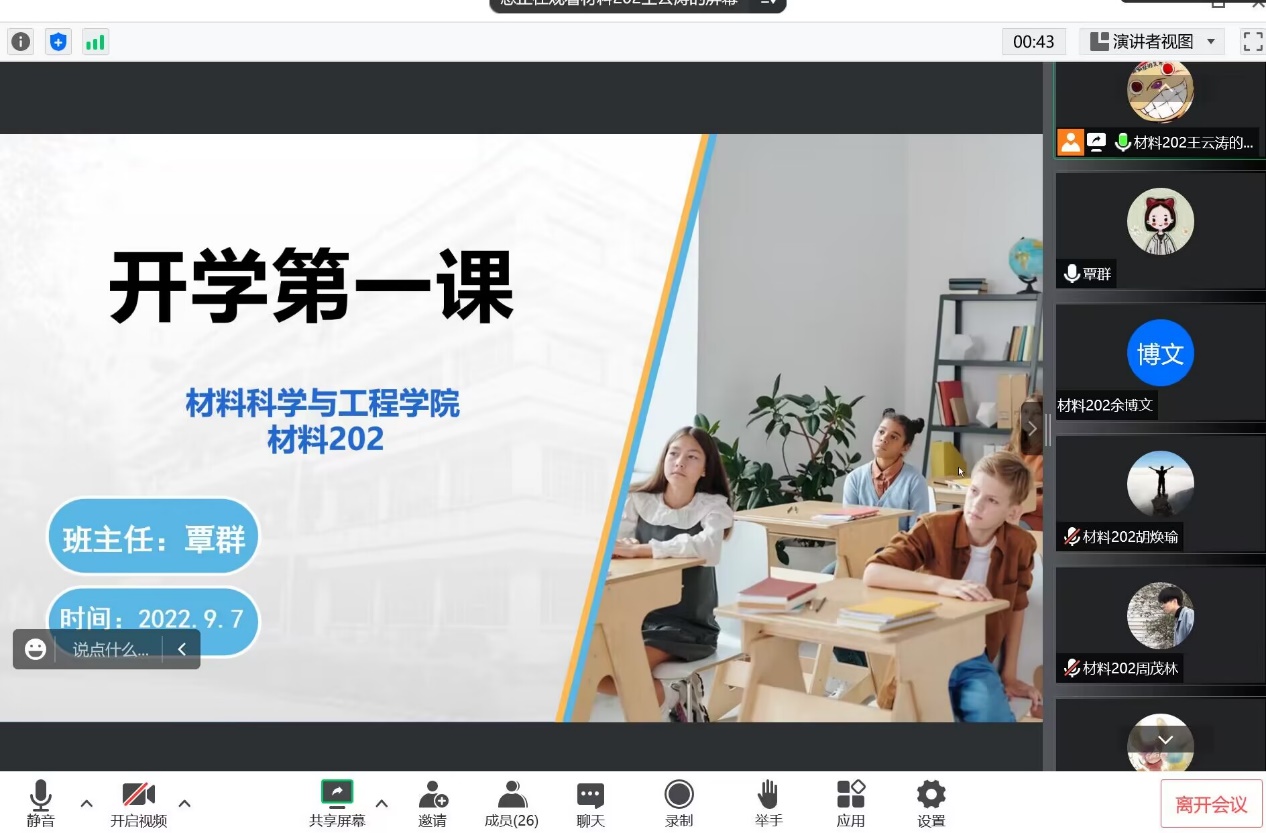 为深入贯彻关于组织开展2022年秋季学期“开学第一课”主题班(团)会的通知,进一步做好开学后学风建设、疫情防控、思政教育和安全教育等工作,材料学院各班级积极组织“新的起点,新的耕耘”主题班(团)会。