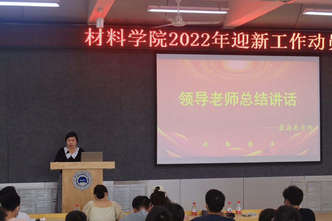 最后由崔海英老师进行总结讲话,她表示迎新工作不易,一是要心怀感恩,希望各位学生干部、志愿者们能够积极配合,迎难而上;二是要高度重视,迎新工作是展现学校、学院形象的重要渠道,参与迎新的同学要不仅要外树形象,还要内聚人心,传递正能量;三是要确保迎新工作在合理的协调安排下做到整体联动,无缝对接,形成协同合力,提高工作效率;四是要做到热情周到,争取工作在一线、问题解决在一线、人文关怀在一线;五是要遵守疫情防控规定,做好相应工作准备。