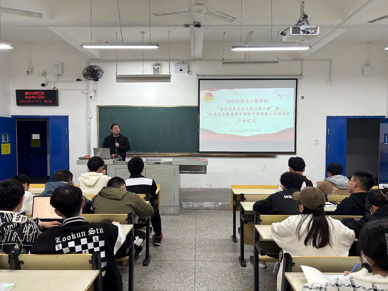 为进一步加强广大团员青年的理论知识学习,提升团学干部的实践能力和综合素质,大力加强学生干部队伍建设,03月19日晚上,材料学院“青马工程”暨团学组织干部后备人才培训班开班仪式在6206教室举行,院分团委书记骆无思,分团委、学生会、志联材料分会、新媒体等四大组织团学干部参加了开班仪式。
