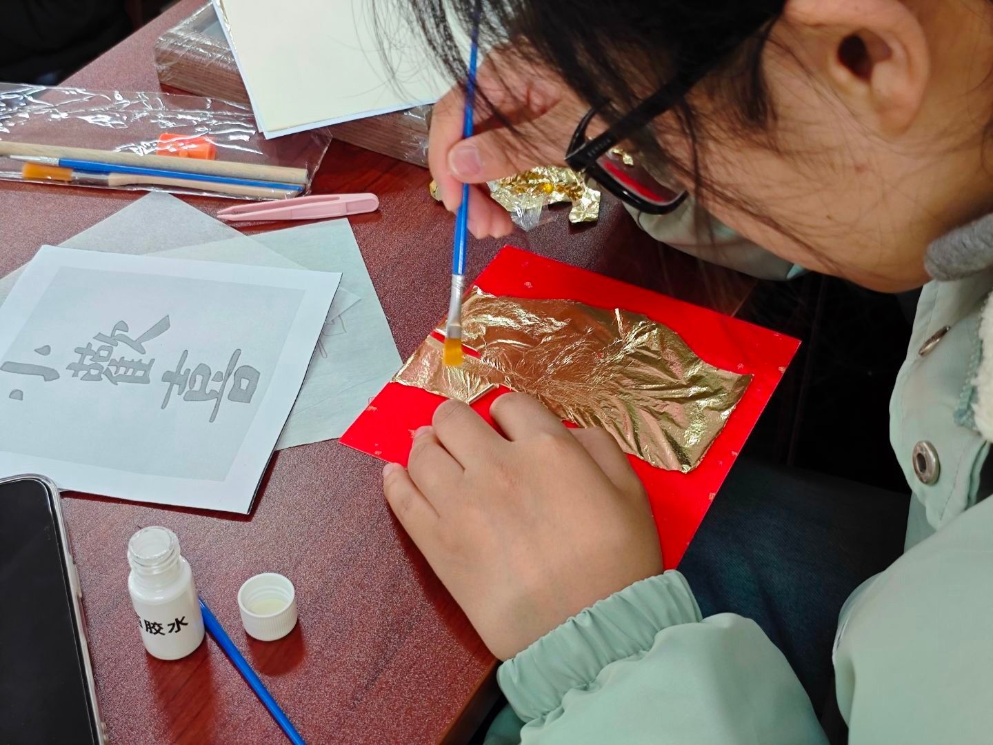 金箔为媒传匠心非遗技艺润心田。金箔锻造技艺是中国传统手工技艺的瑰宝,南京金箔锻制技艺更是被列入国家级非物质文化遗产名录。活动中,学生们以铅笔勾勒创意、以胶水定位匠心,再通过镊子轻拈金箔、软毛刷按压定型,每一步都需专注与耐心。非遗传承实践小组负责人黄煜现场讲解道:“金箔薄如蝉翼,贴金需心手合一,这不仅是对技艺的考验,更是对心性的磨炼。”参与学生彭千慧感慨:“金箔在指尖流转时,仿佛触摸到了千年前的匠人智慧,这种‘慢工出细活’的精神,让我对工匠精神有了更深的理解。”通过沉浸式体验,非遗技艺不再是书本上的遥远符号,而成为鲜活的文化基因,悄然扎根于青年心间。