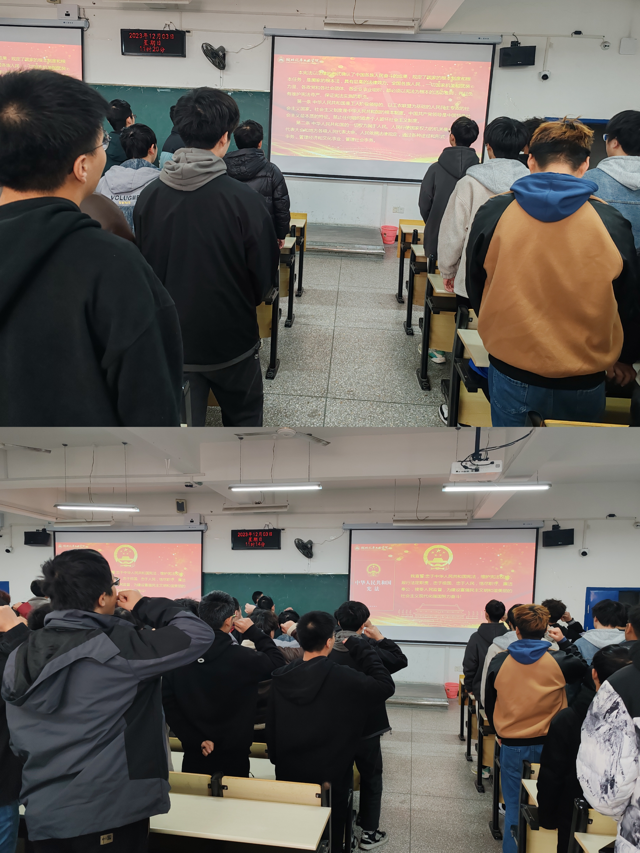材料学院组织开展2023年国家宪法日“宪法晨读”、“宪法宣誓”活动,组织班级通过普法网收看宪法宣讲网络直播,与会学生一同诵读《中华人民共和国宪法》部分条款,同学们精神饱满、情绪激昂,句句铿锵有力,让宪法“声声入心”。