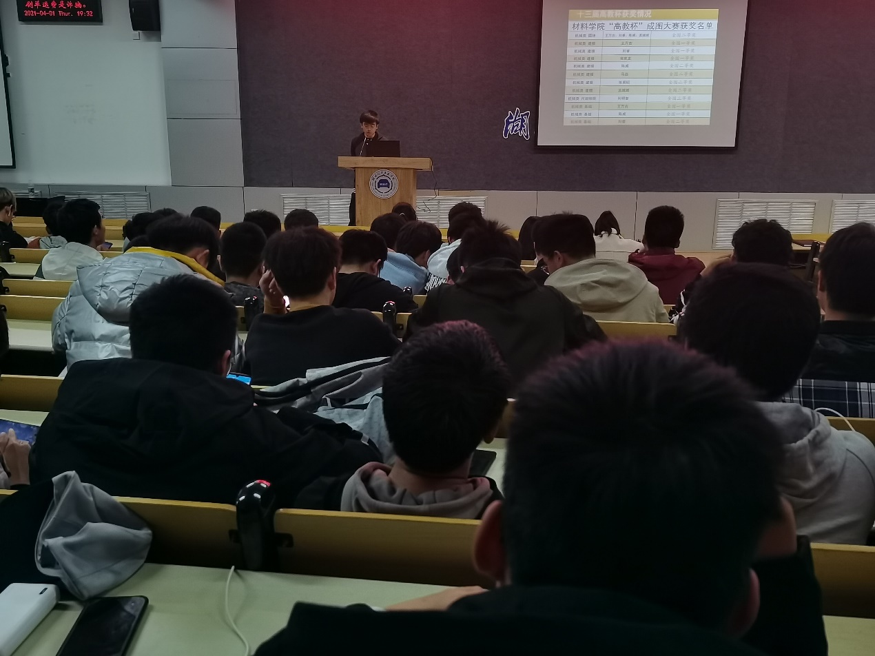 为动员我院学生积极参加科技竞赛,营造浓厚科研氛围,4月1日晚,材料学院在6113教室召开2021年“高教杯”和3D动力大赛宣讲会。金工科协指导老师李怀君、分团委老师骆无思、全体协会成员及参赛同学共200余人参加了宣讲会,会议由协会会长何明智主持。