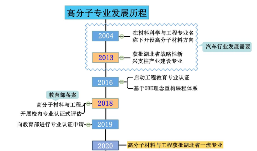 我校2004年开设高分子材料与工程方向,同年成立高分子材料教研室,2013年专业获批湖北省高等学校战略性新兴(支柱)产业人才培养本科项目,2018年高分子材料与工程专业名称进行备案并进行校内预评估,2019年本专业申请工程教育认证评估,2020年获批湖北省一流专业。