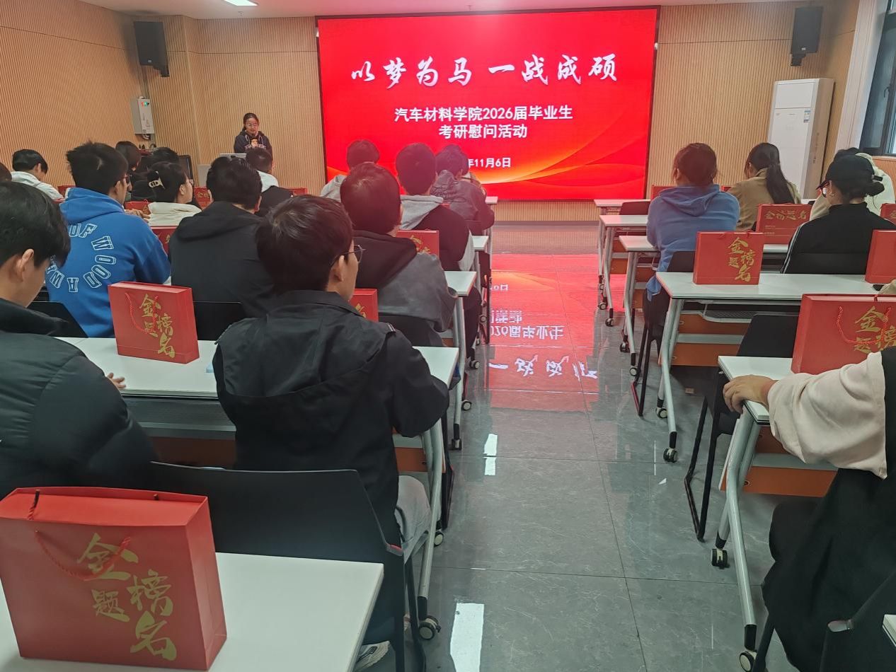 为助力2026届考研学子坚定信念、冲刺备考,11月6日中午,汽车材料学院在强国楼520会议室开展“以梦为马 一战成硕”考研慰问活动,为逐梦研途的学子们加油鼓劲、传递温暖。